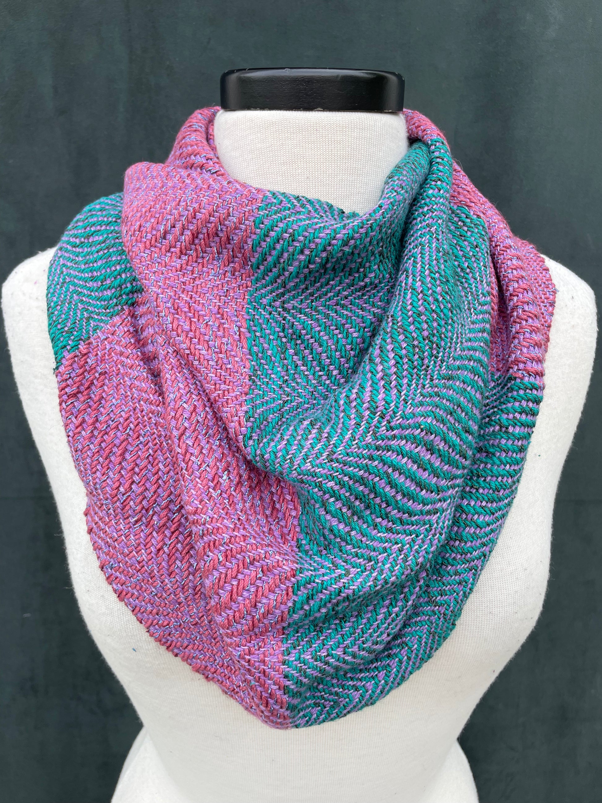 Cowls are the signature product of Bri Weaves & my favorite, both to make & to wear. They are short & wide infinity scarves; they only go ‘round your head once. I promise there’s no right or wrong way to wear them. Put it over your head & it’s perfect. Everyone comes to enjoy adjusting them their own way. I did make a video that may help if you really want direction.
