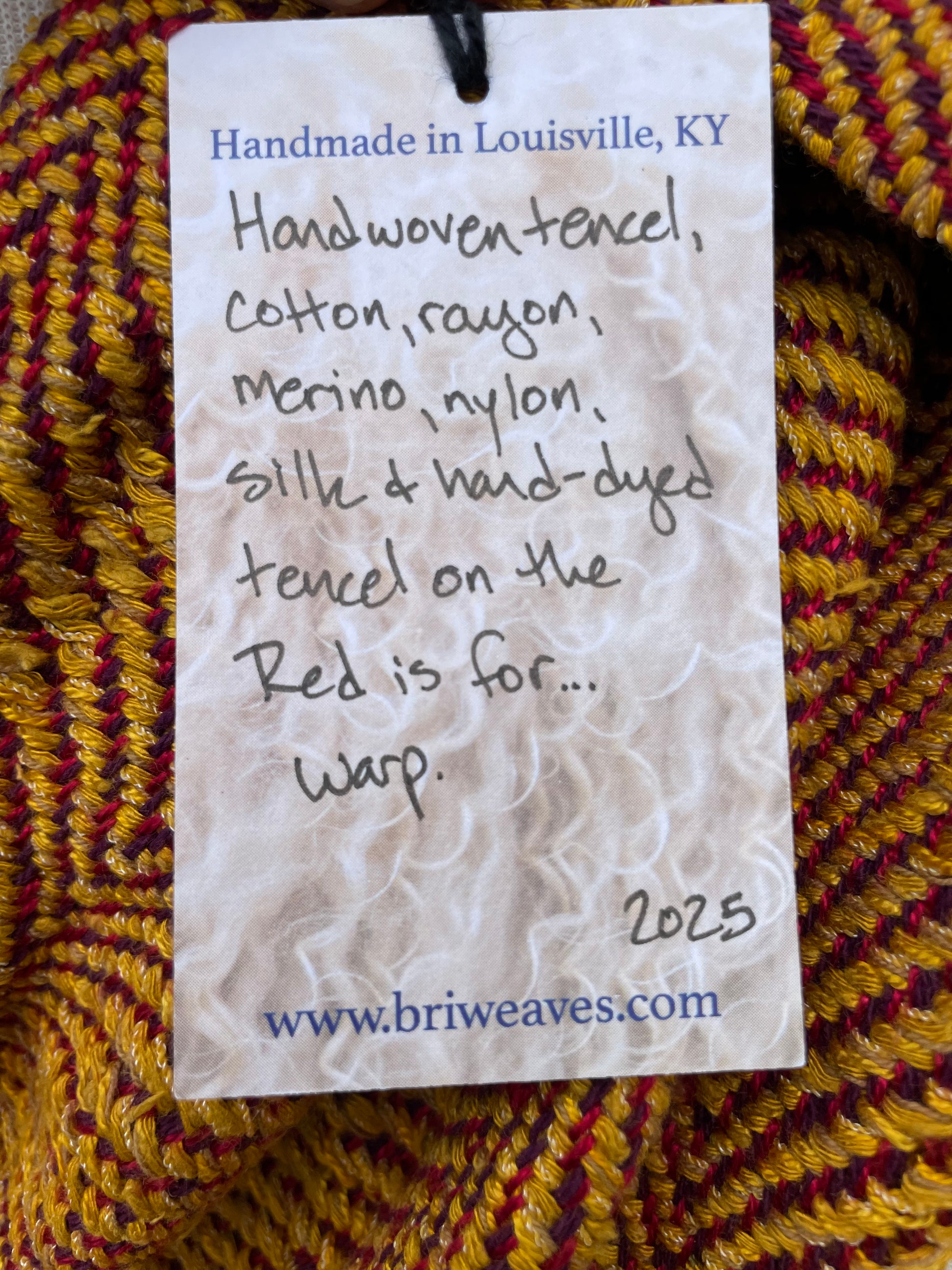 Cowls are the signature product of Bri Weaves & my favorite, both to make & to wear. They are short & wide infinity scarves; they only go ‘round your head once. I promise there’s no right or wrong way to wear them. Put it over your head & it’s perfect. Everyone comes to enjoy adjusting them their own way. I did make a video that may help if you really want direction.