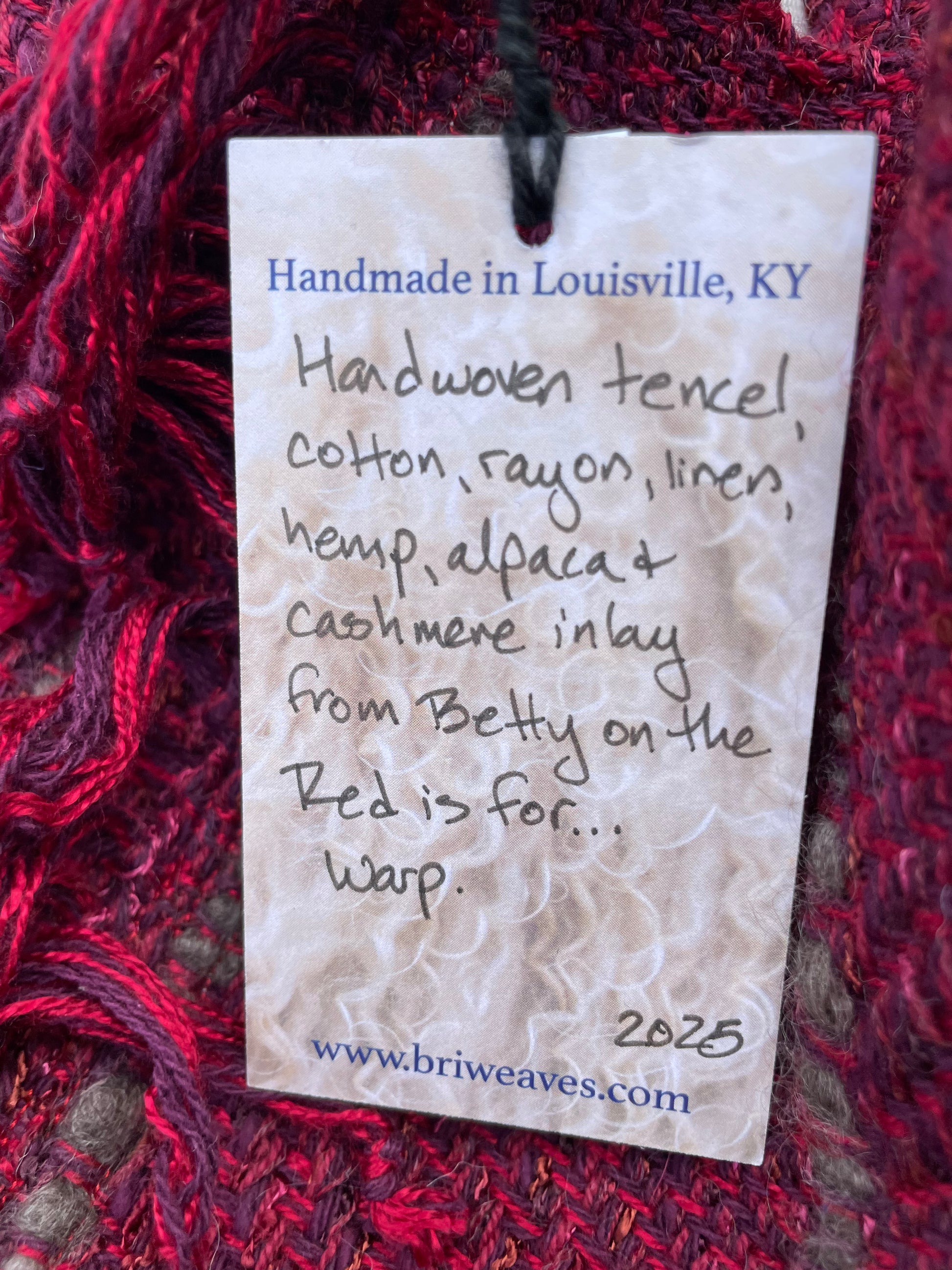 Cowls are the signature product of Bri Weaves & my favorite, both to make & to wear. They are short & wide infinity scarves; they only go ‘round your head once. I promise there’s no right or wrong way to wear them. Put it over your head & it’s perfect. Everyone comes to enjoy adjusting them their own way. I did make a video that may help if you really want direction.