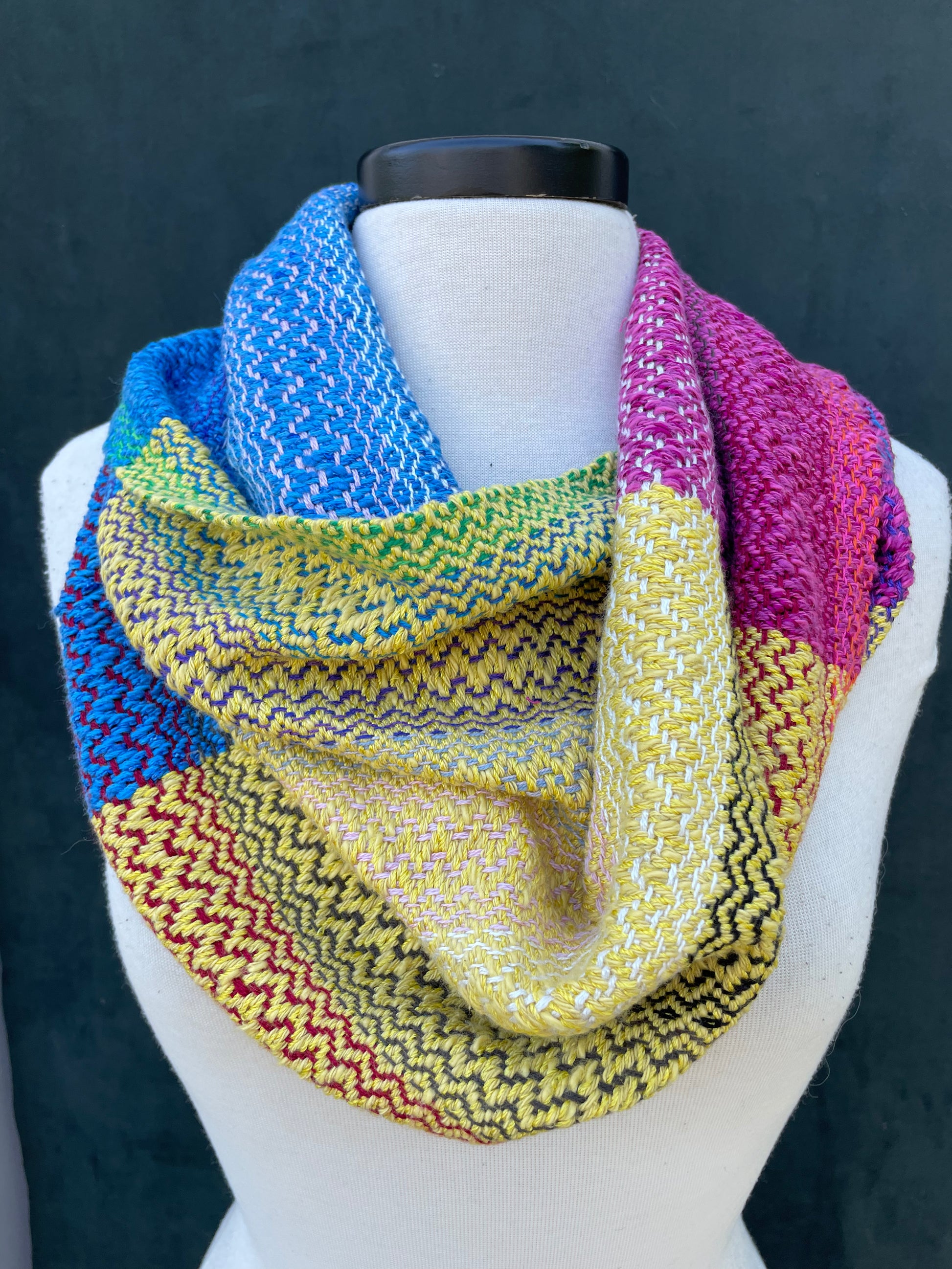 Cowls are the signature product of Bri Weaves & my favorite, both to make & to wear. They are short & wide infinity scarves; they only go ‘round your head once. I promise there’s no right or wrong way to wear them. Put it over your head & it’s perfect. Everyone comes to enjoy adjusting them their own way. I did make a video that may help if you really want direction.