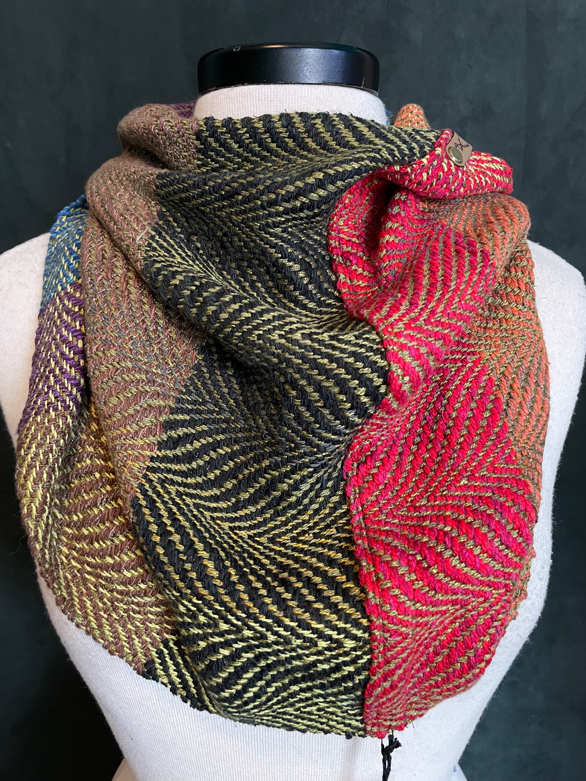 Cowls are the signature product of Bri Weaves & my favorite, both to make & to wear. They are short & wide infinity scarves; they only go ‘round your head once. I promise there’s no right or wrong way to wear them. Put it over your head & it’s perfect. Everyone comes to enjoy adjusting them their own way. I did make a video that may help if you really want direction.
