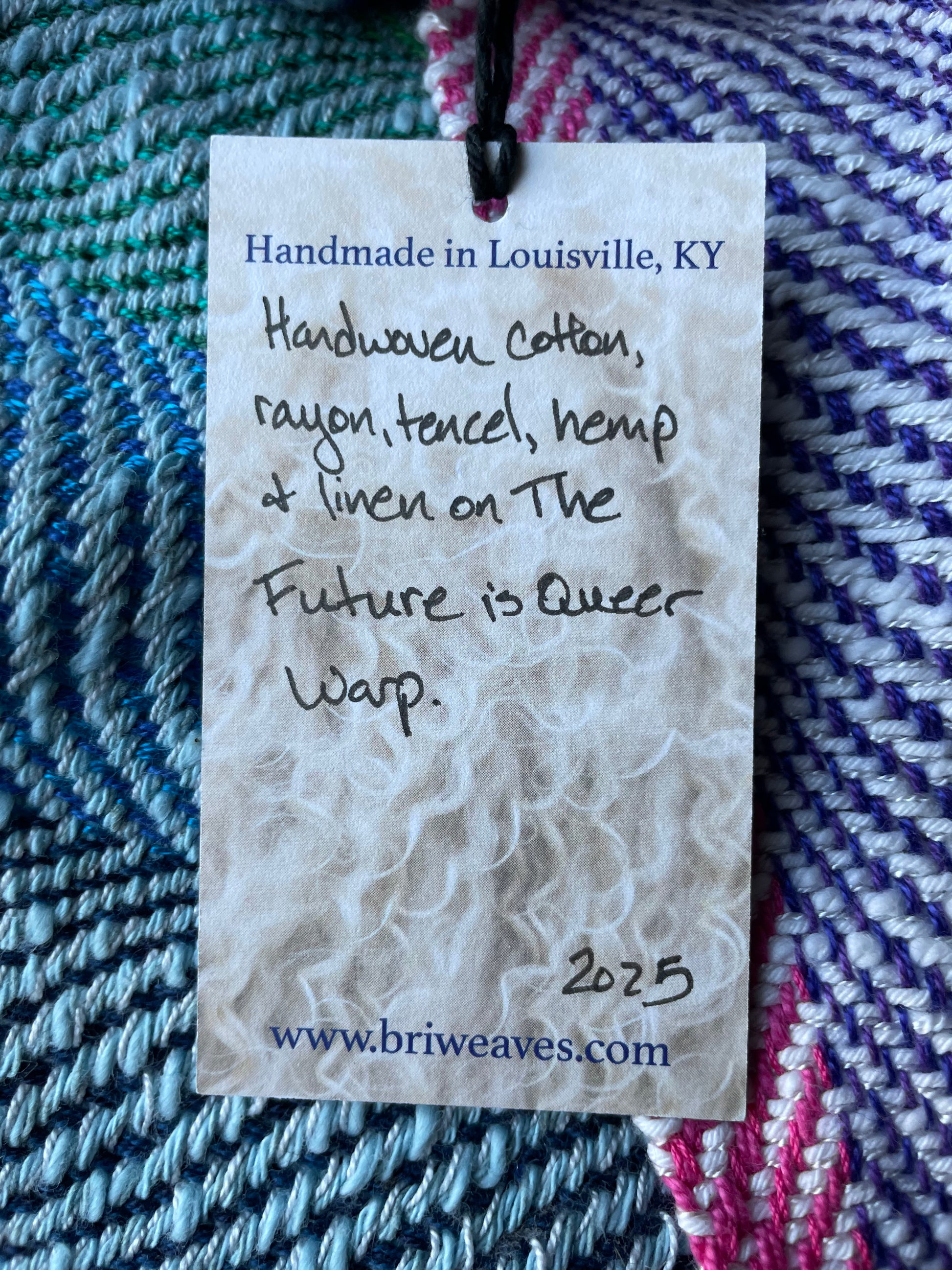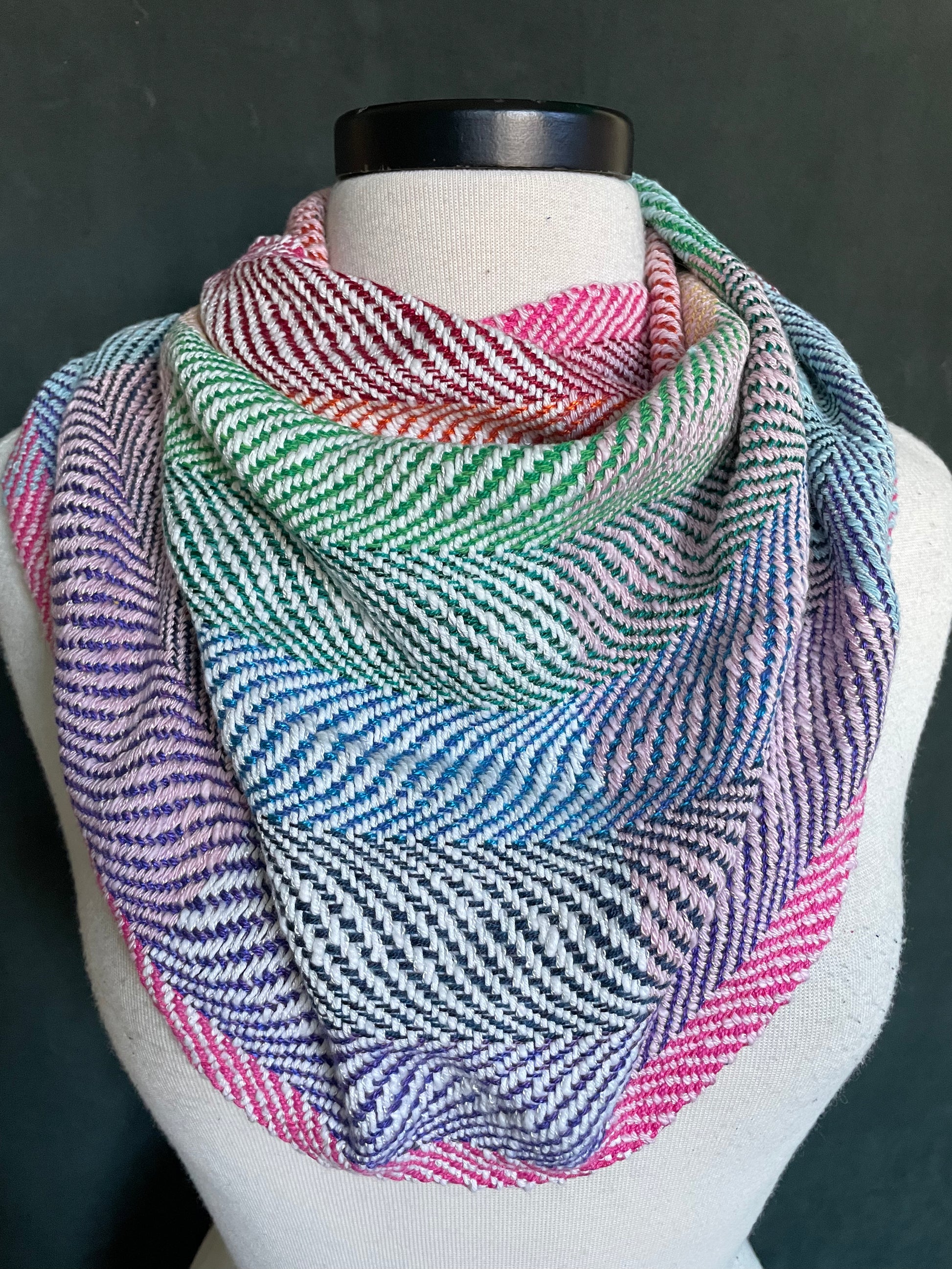 Cowls are the signature product of Bri Weaves & my favorite, both to make & to wear. They are short & wide infinity scarves; they only go ‘round your head once. I promise there’s no right or wrong way to wear them. Put it over your head & it’s perfect. Everyone comes to enjoy adjusting them their own way. I did make a video that may help if you really want direction. Weft here is in Trans Pride colors.