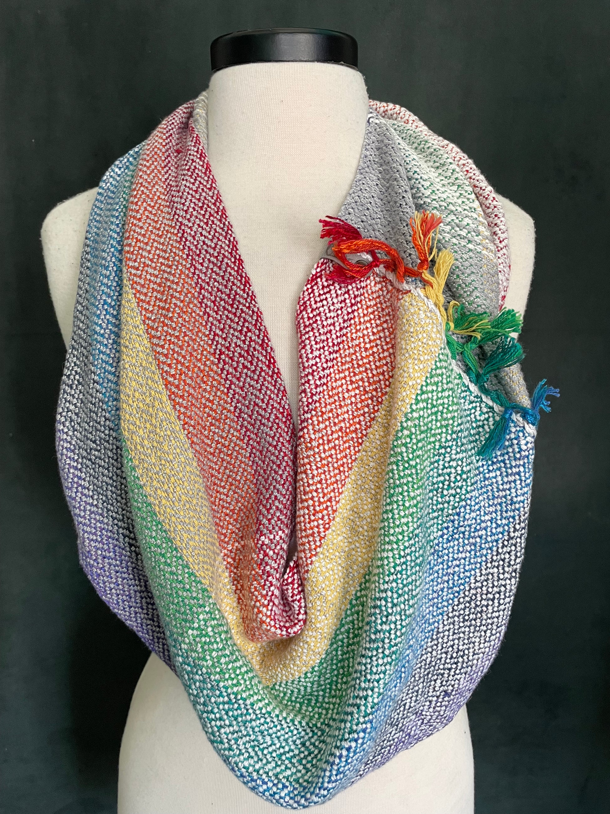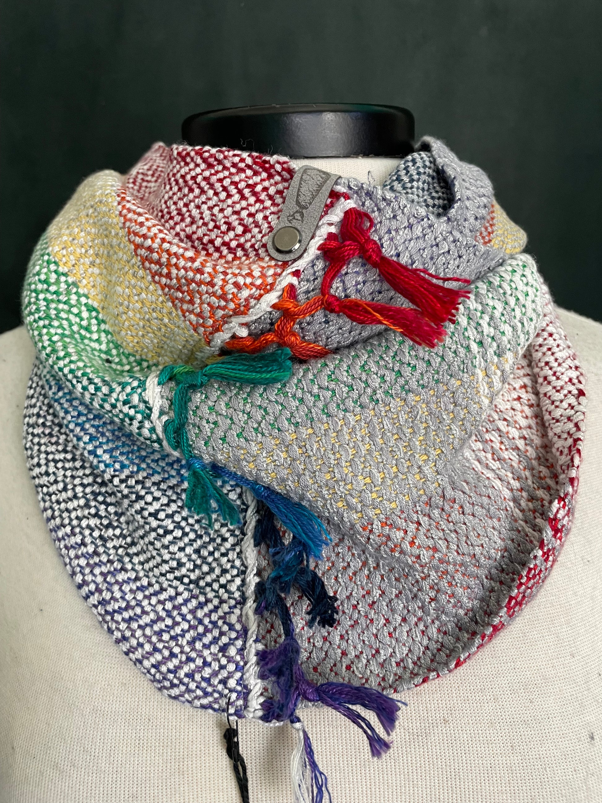 Cowls are the signature product of Bri Weaves & my favorite, both to make & to wear. This is a rare extra long one (50") that may go ‘round your head twice. I promise there’s no right or wrong way to wear them. Put it over your head & it’s perfect. Everyone comes to enjoy adjusting them their own way. I did make a video that may help if you really want direction.
